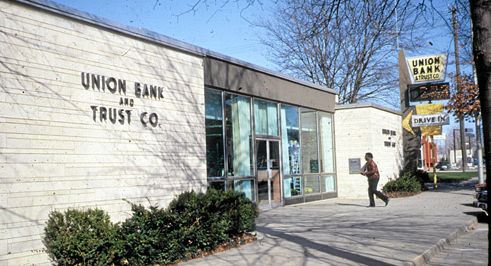 Customer walking into the Union Bank & Trust location in the 1970s.